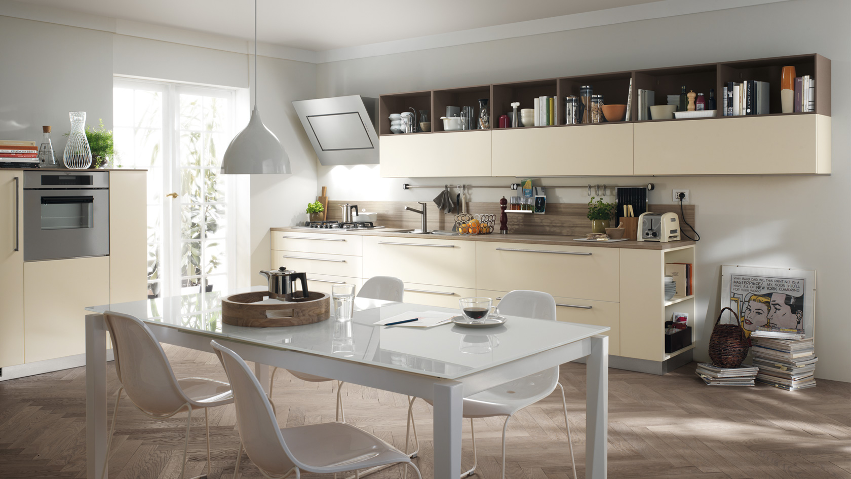 By combining practicality with a stylistic light touch, Feel fits naturally into an open space layout that merges the pleasures of cooking, relaxation and dining. Even the most strictly functional areas (with the latest appliances and accessories) blend easily into the various furnishing solutions: part of a single, sophisticated project in which the Kitchen and living area share the same minimalist design and attractive finishes.