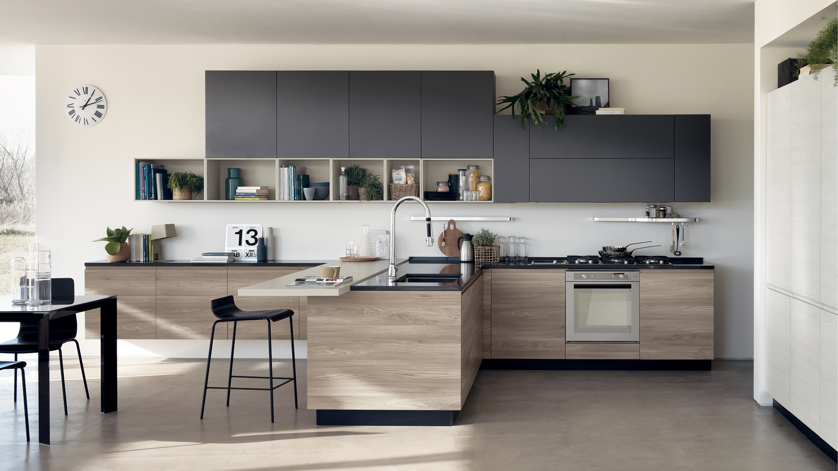 The Motus project by Scavolini, designed by Vittore Niolu, brings together function and entertainment, privacy and familiarity, using “independent” elements that can be put together and taken apart, and even recombined over time, based on the available space and functional needs. The idea of kitchen and living room evolves in total creative liberty. A brand new proposal that allows an infinite number of configurations: surprising not only in its unusual lines but also in its essential and elegant design with details that reveal a new identity of the environment we work and live in today. Marks of distinction include the asymmetric opening of the door with no handle, the unique interpretation of the glass door, the geometry of the shaped drawer, the new island and peninsula units; and the sophisticated chromatic range of the elements (gloss and matt lacquer, or melamine with matching finishes) proposed in a line dedicated to today’s most popular colours.